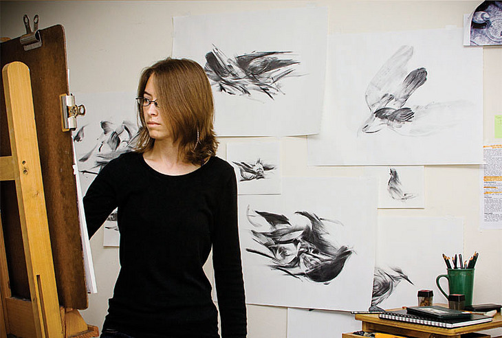 Born in Memphis, Tennessee, Megan Wolfe is an artist and freelance photographer residing in Oakland, California. A “reformed realist”, Megan Wolfe created a series of realism works that focused on urban scenery before transitioning into expressive, and reductive, works of the same subject matter. Currently, she is classified as an abstract artist. Megan Wolfe is best recognized for her drawings of pigeons, but she continues to work on her abstract series of knives and figures.