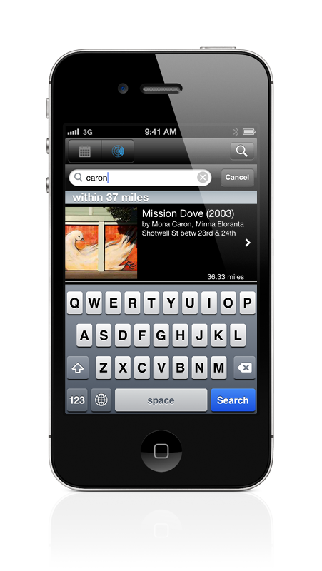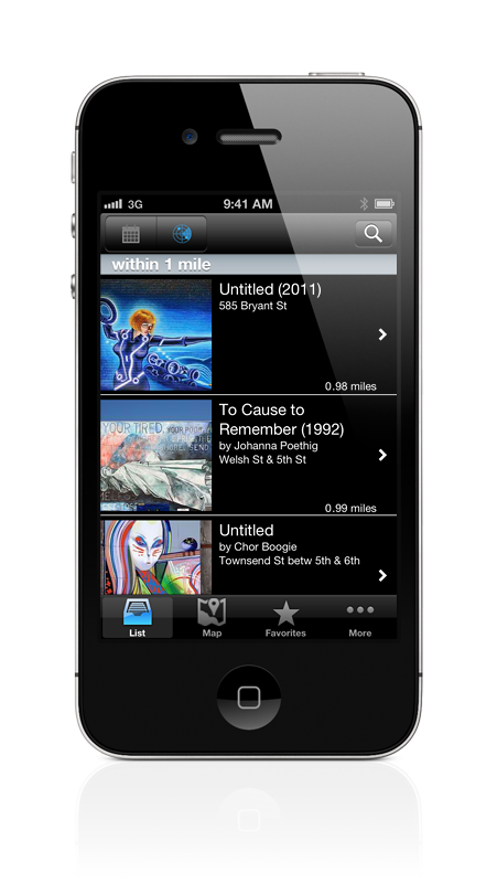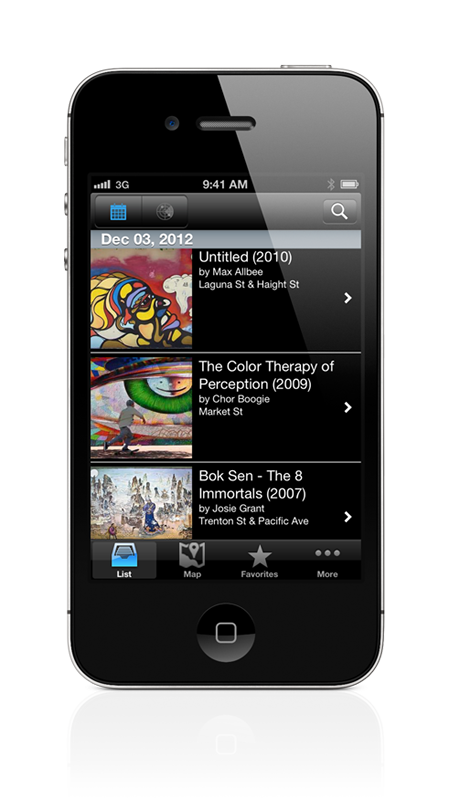 On the List tab, you can browse the collection by the most recent additions or by the distance from the current location to the murals. Mural entries are grouped by the posted date or by the distance. Each mural entry displays a thumbnail image of the mural and a short information about the mural including the mural title, year completed, artist name, street location, and the Detail button. Tapping the Detail button opens the Mural Detail view.