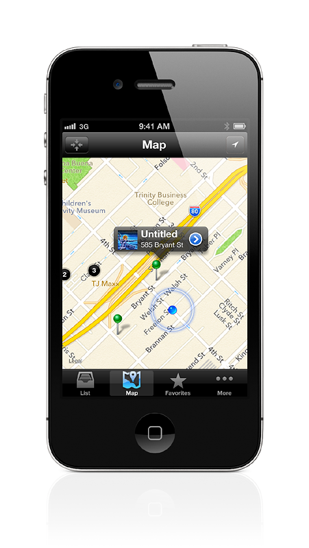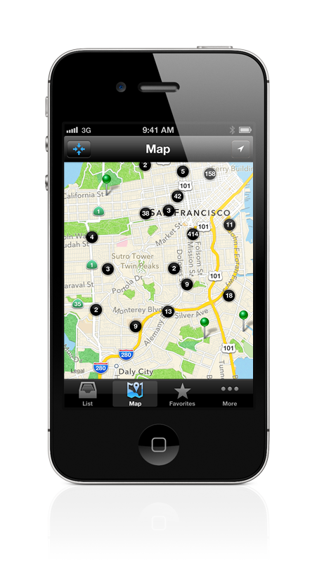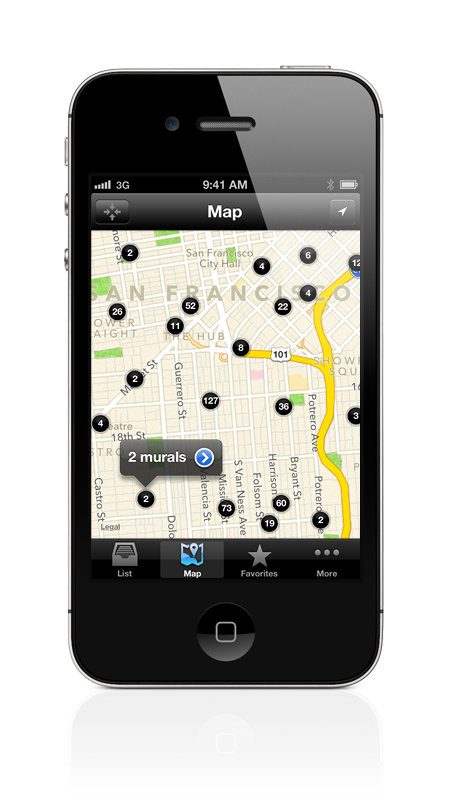 On the Map tab, you can view the exact location of the piece. Murals are rendered on the map as clusters or as green pins for individual murals. When you zoom in or out, the grouping changes and you can see new rendered clusters and pins. Tapping a cluster displays the cluster annotation and the Detail button. Tapping the Detail button opens a list of murals included in the cluster. Tapping a pin displays the mural annotation including a small thumbnail image, the mural title, the mural street address, and the Detail button. Tapping the Detail button in the mural annotation opens the Mural Detail view.
